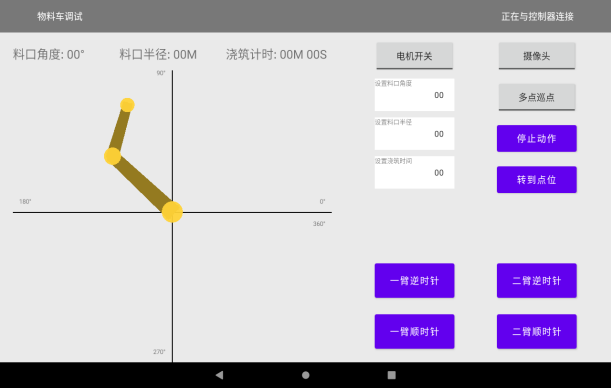 借助APP可實時監(jiān)測各臂架回轉(zhuǎn)角度、澆筑半徑、巡點進度、電磁閥狀態(tài)及系統(tǒng)報警信息,并實時查看出料口視頻影像,全程可視、可控。